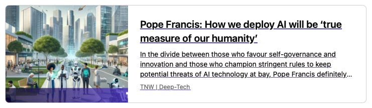 Pope Francis, in his message titled "Artificial Intelligence and Peace" for the World Day of Peace, acknowledges the transformative potential of AI while advocating for its responsible and ethical deployment. He highlights the benefits AI offers, including liberation from mundane tasks and more efficient processes, as well as its capacity to foster innovation and economic growth. While urging for international cooperation in regulating AI to mitigate potential risks, the Pope emphasizes the importance of inclusivity and compassion in AI development, aiming to ensure that the technology serves the common good and uplifts the most vulnerable in society.